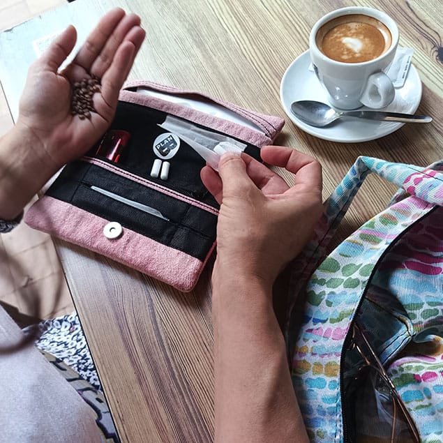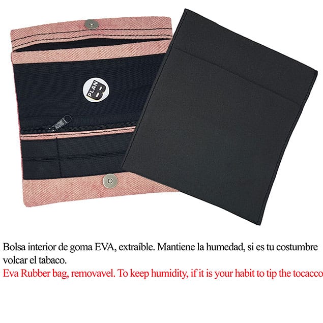 Múltiples compartimentos: departamento para picadura (hasta 50 g); bolsillo para filtros con cierre de cremallera; dispensador de papel.